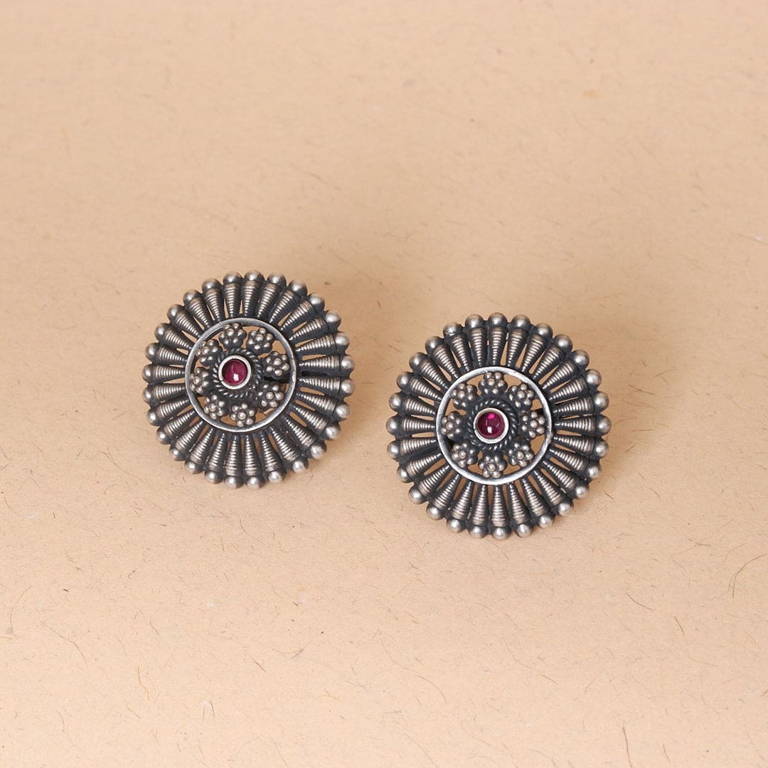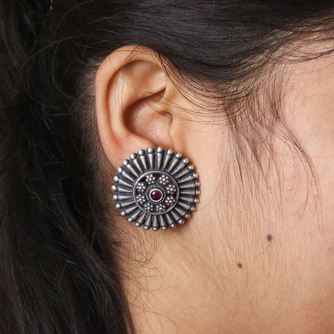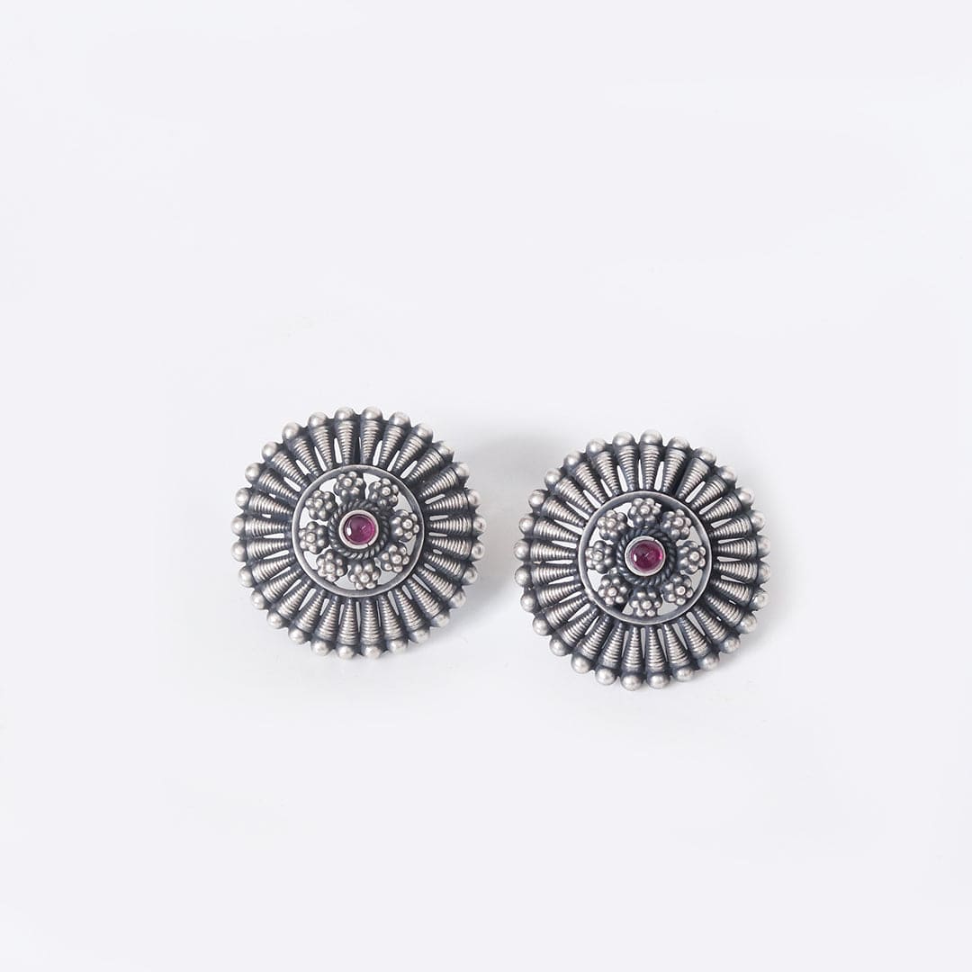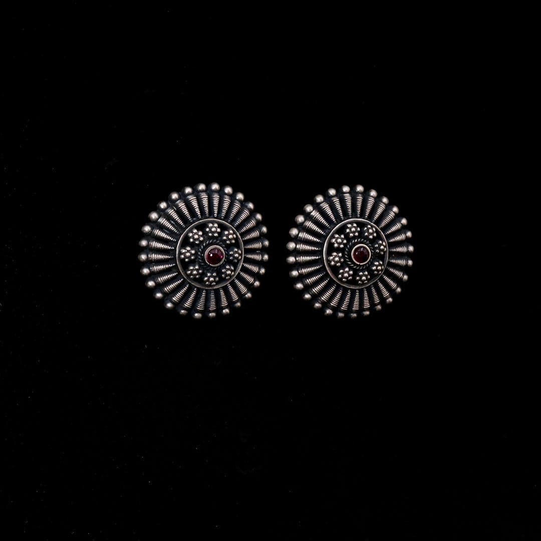 Add a classic touch to your style with these handcrafted ethnic round studs in sterling silver with a hint of semiprecious stone. Designed to elevate any outfit, these studs bring a beautiful cultural flair to your look.